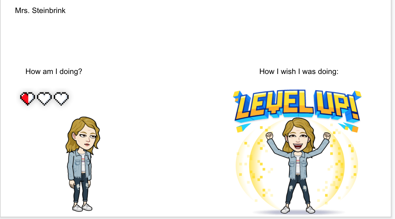 Because I try to create a close knit community in each of my classes, I take the advice of Tara M. Martin frequently and allow myself to Be Real. So once we started sharing how we were doing on our Slides, my students wanted to know how I was doing each day, so I began adding my Bitmoji to my very own slide too. I debated at first on how real to actually be, but once I started participating, I found it easier and easier to just be me. While I project my very best while with students, I decided that it might help them, or at least some of them, to see that I am human, I struggle, and I always hope for better.