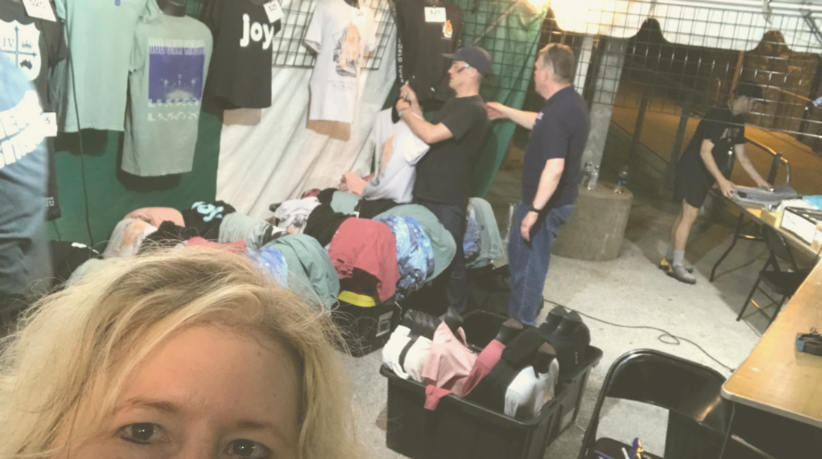 So customers came and went, in rushes and in pairs. We rotated into the concert and our reserved seats during the lulls, always leaving one of us in the booth, and then during the big onslaughts of customers, it was all hands on deck. I chatted with customers, pretended I knew what the band planned to do right after the concert, that I knew about the latest release (I knew what Will told is in 2 of the 10 minutes of training), and I agreed that 2 of the shirt designs were made out of the softest material ever. I made sure customers who wanted to touch, check out, then reject multiple shirts did not feel like they were a burden. They weren’t. They just wanted to be sure that the $25 they were about to spend on a shirt would be well spent. I made sure they effort they were taking was well received. I smiled, assured them all was well, and did my best to help them find the right product that suited their needs. Tom and Cayl, my husband, were doing the same. We stocked merch, slung rejected shirts over our shoulders (one shoulder), worked up a sweat (August in Missouri is not a cool time of year, typically), and made it through the night without a single made customer. I enjoyed every minute of it.