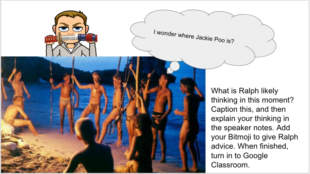While it’s true that we don’t need Seesaw to find out what students are thinking, this tool makes it so easy for students to explain their thinking in a variety of ways. In one recent assignment, I had students select a quote from our current reading of Lord of the Flies, take a picture of the page in the book (either within Seesaw or with their phone and upload it to Seesaw & could also use Snapchat or Google Drawings to add their Bitmoji or clipart), underline or circle the quote/passage, type out a brief explanation, and then use the microphone to explain more fully why that passage or quote grabbed their attention. Did they find a personal connection to it? This not only will help me understand how my students are thinking as they read the novel, but will also help them find ways to connect to the content, which is sometimes hard for them to understand on the level that they need to understand it.