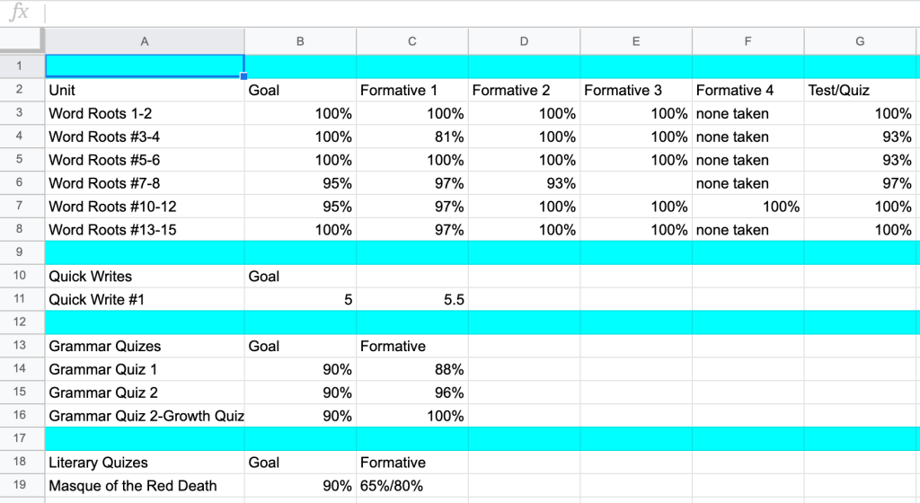 When I first started goal setting academically with my students, we focused solely on vocabulary. Using the Fast and the Curious Eduprotocol by Jon Corippa and Marlena Hebern, we do one to four formatives a week, typically starting on Monday and using Quizizz. We start the class period with the Quizizz over the current vocabulary, but before beginning that, students create a spreadsheet (works with Google Sheets or Microsoft Excel) that includes the unit name, goal, four formatives, and then the test or quiz score. We set the goal prior to beginning the unit or set of words for the week based off of the research done by John Hattie and his self reported grades, which consistently rank high among influences on student achievement. The key here is for you, the teacher, to know what the goals are that your students set and then encourage them to beat that goal.