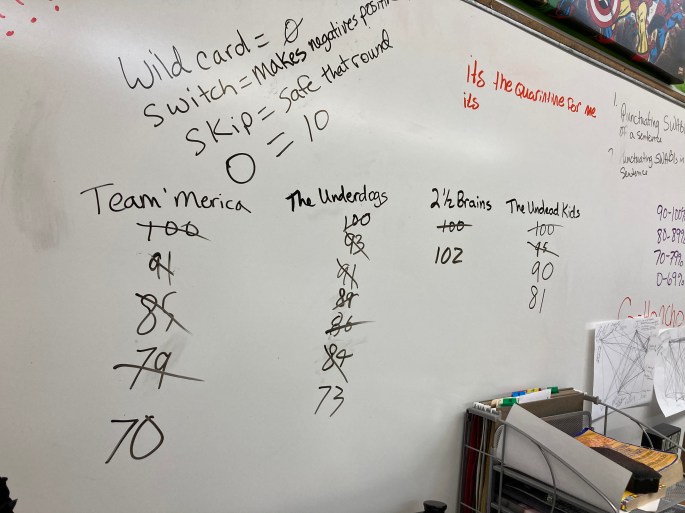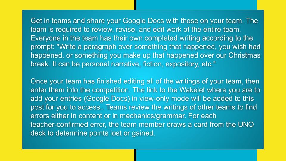 My original idea was to start each team off with 100 points. Each time a team found a mistake in the writing of someone from a different team, they would lose points. The team with the most points at the end of the hour would be declared the winner. Wondering how to make it better, I asked my first hour class what gaming elements could we add to improve the level of fun. One student, Noah, did not hesitate and replied, “UNO.” Another student immediately made the same connection as Noah had. They explained the concept and we set it up immediately. Here’s the refined version after we made adjustments during class.