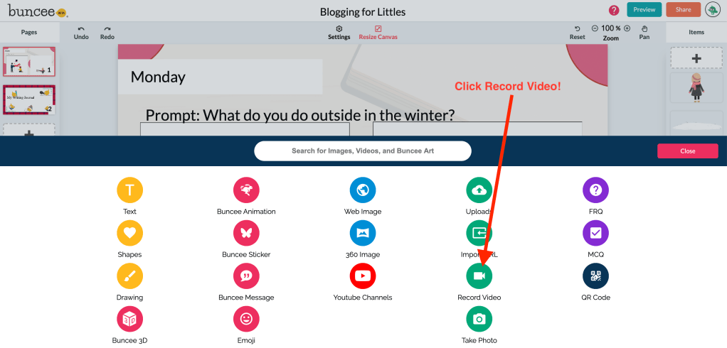 Vlogging with Buncee is even easier! Students click the plus to add content, and instead of choosing a sticker or text, they can select video.