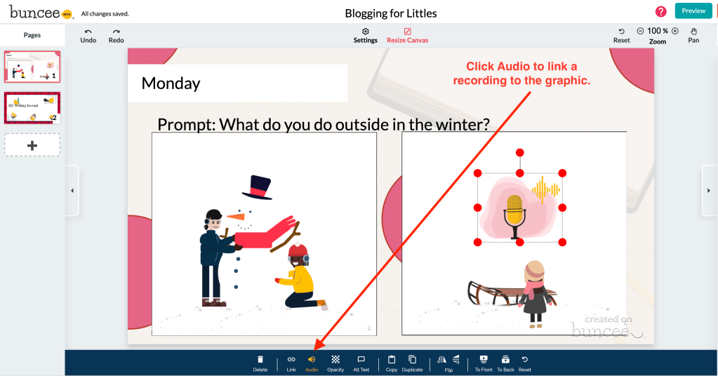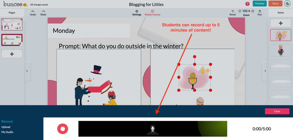 Then students are ready to record their podcast. They can talk for up to 5 minutes from within the Buncee platform per image to which they link audio.