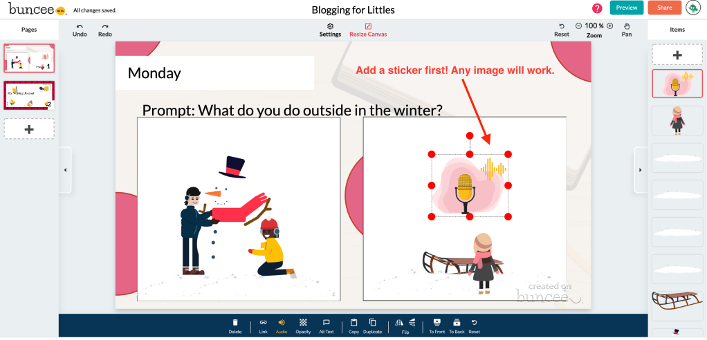 From the template or presentation the student is using for their blog, they add a sticker (image) and place it in the area where the response to the prompt would go. When they click on it after place it, the audio option appears at the bottom of the screen in the tool bar.