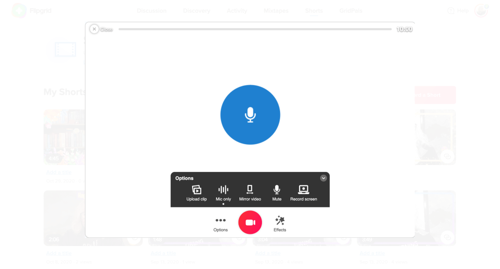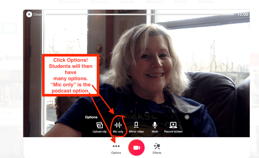 If students want to create the video, then that’s all they have to do to get started. The video can be up to 10 minutes long, but you may want to limit that within your prompt or instructions. If students aren’t wanting to create a video blog but rather a podcast or audio segment, then they need to select “options” after clicking “Record a Short.”